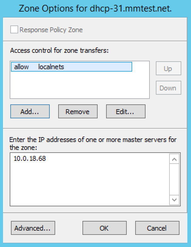 The master servers are specified in the lower half of the Zone Options dialog box. To add a new server to the list, simply click in the white space and enter the IP Address of the master server you are assigning.