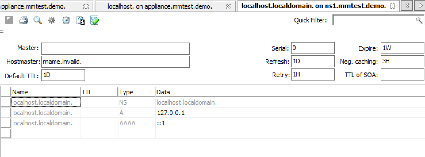 Since the SOA record is seldom modified after it is created, the Zone tab has a built-in control to allow you to conceal the SOA panel from view. This allows you to view more of the resource record area below. If you look at the left edge of the Zone tab, just above the record table, you will notice three short horizontal lines, stacked vertically. This is the Hide/Show SOA panel control. Click on this control once to hide the SOA panel. Click on it again to make it re-appear.