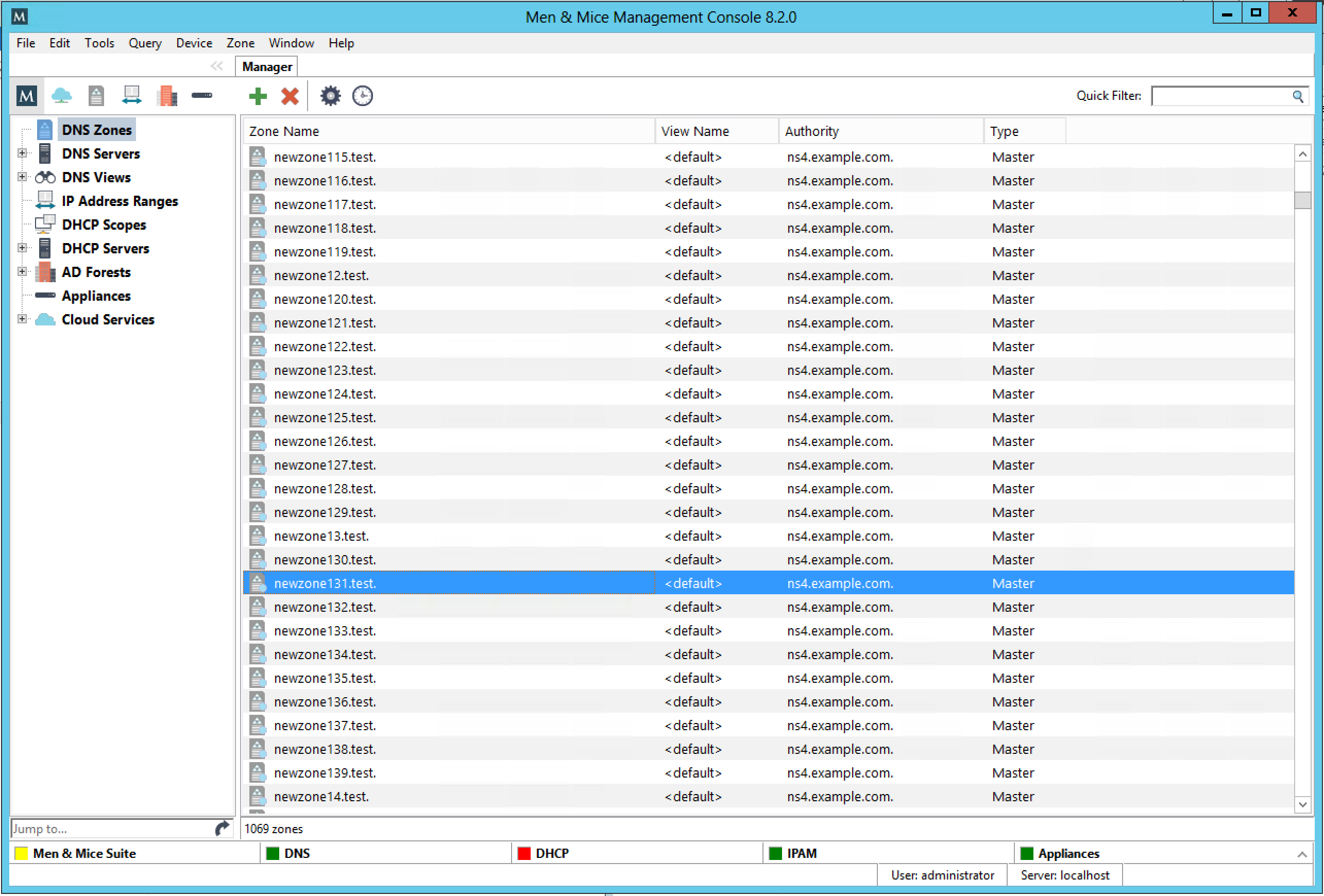 Selecting the DNS Zones object will cause the Detail View to display all DNS zones configured in the system and accessible to the current user. This category is accessible with a valid DNS Module License Key.
