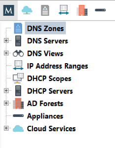 A new feature in version 8.2 is the ability to filter by the type of object in the Object Browser. By clicking on the respective icon at the top of the Object Browser, the Object Browser will show only that type of object. Clicking on the “M” icon to the left will show all types of objects. Note that this applies only to Clouds, DNS, IPAM (Subnets and DHCP), AD Forests and Appliances.