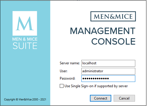 The “Server name” field requires the domain or the IPv4/v6 address of the server running the Men&Mice Central application. (This only needs to be defined once, and will autofill on subsequent logins.) Successful login confirms that Men&Mice Central is running, connected to the database, and accessible for the Management Console.