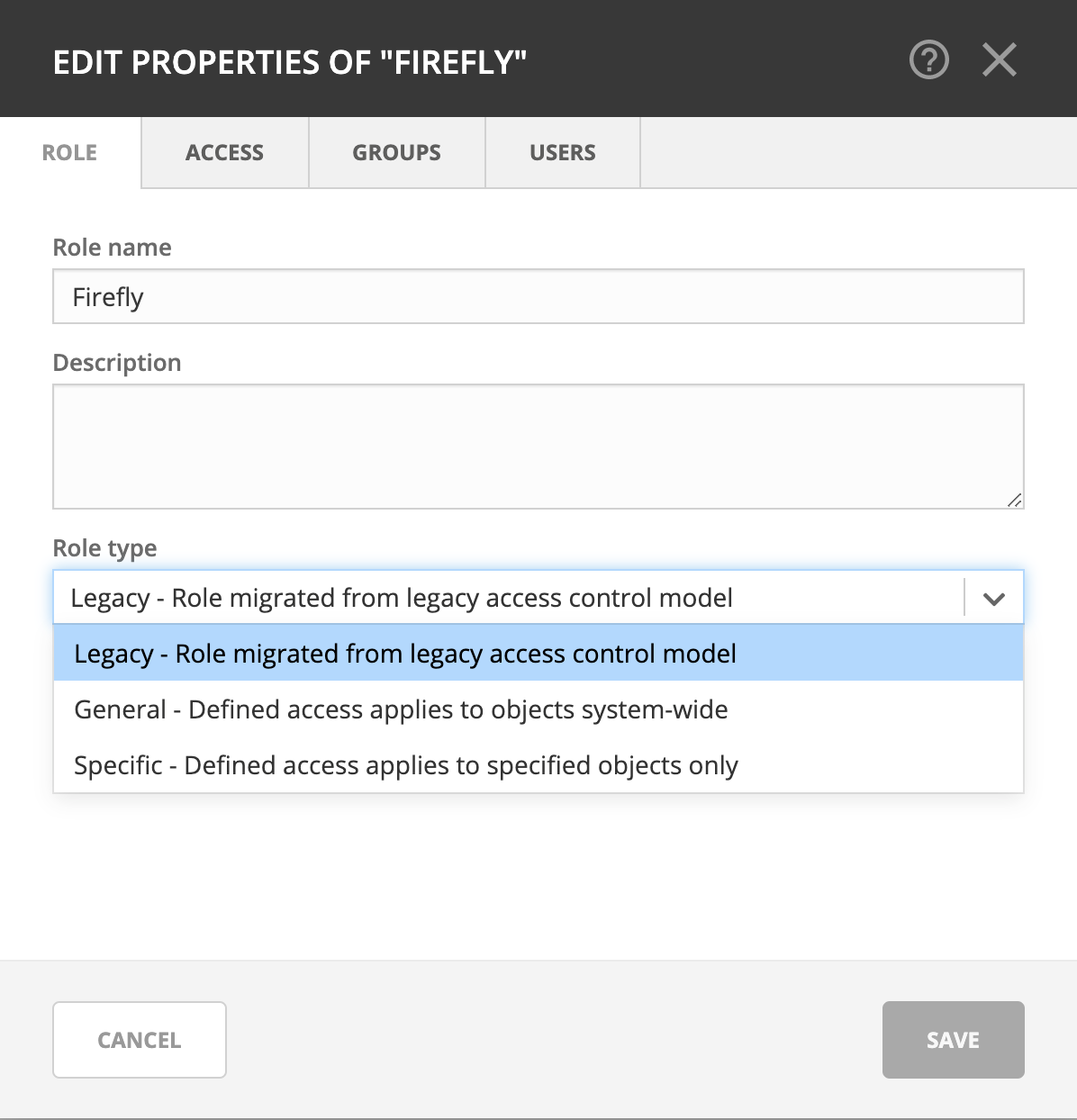 If needed, legacy roles can be converted into a general or specific role, using the dropdown in the Edit role properties action.