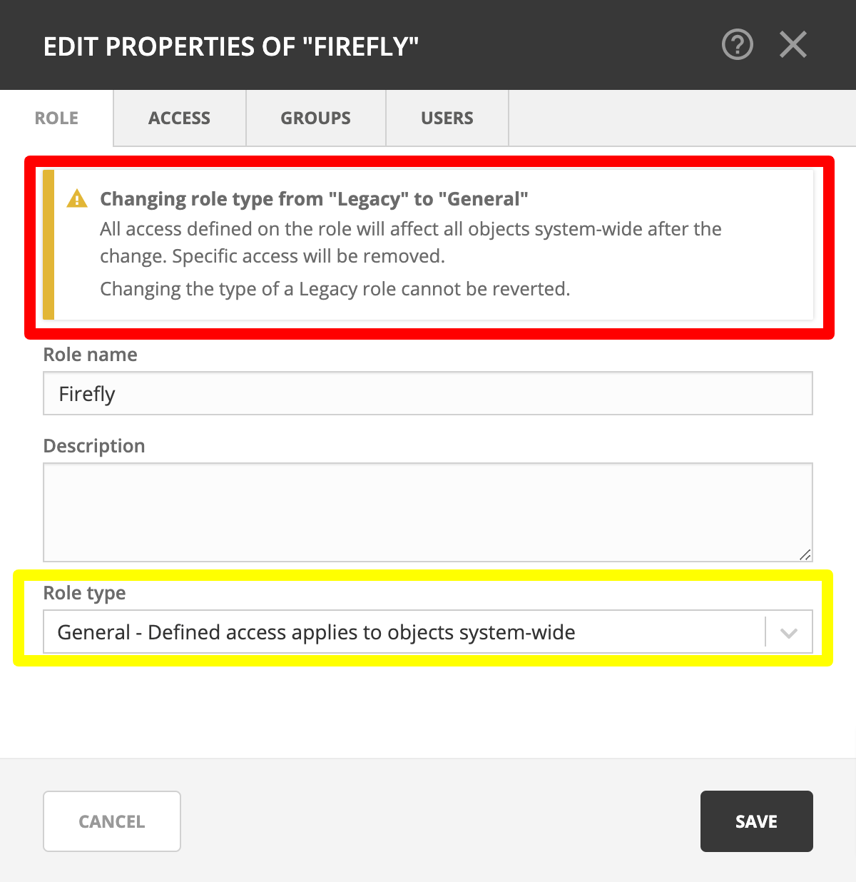 Converting a legacy role into a general role removes all object-specific access and makes the legacy role’s configured permissions applicable to all objects in the system. If the legacy role had general access exclusions on specific objects, these exclusions are also removed.