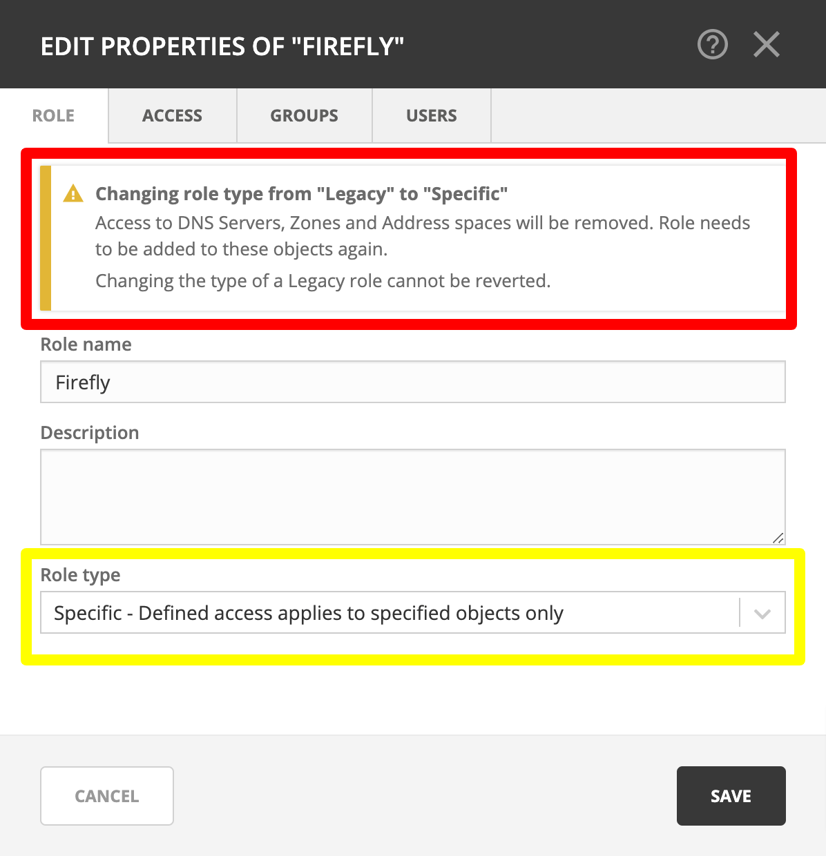 Because of the complicated nature of matching access controls between the old and new models, Men&Mice recommends re-creating the configuration of legacy roles as specific roles, instead of changing the type.