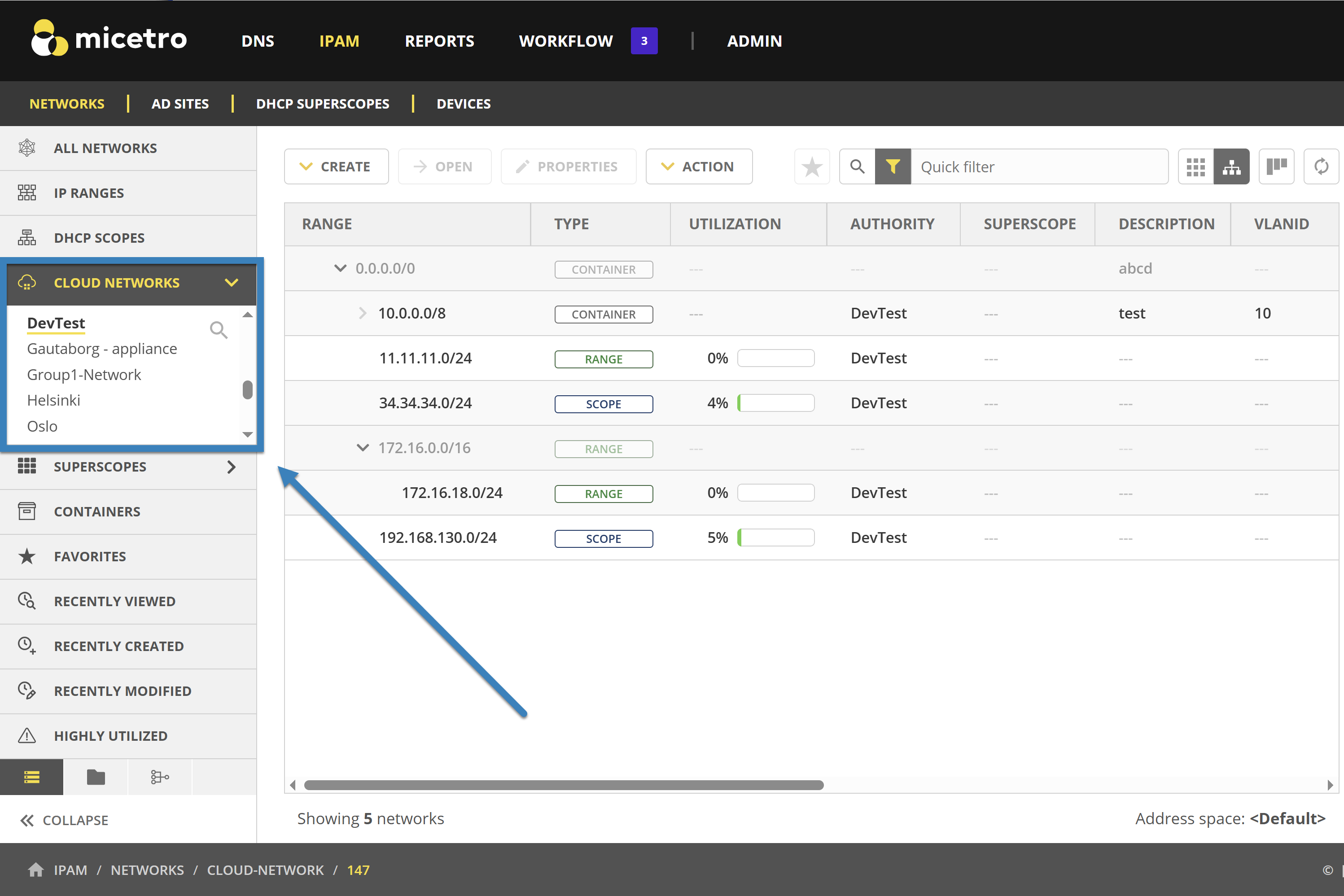 In Micetro, Meraki networks are cloud networks. You can use the Cloud Networks filter in the left sidebar to filter the data grid by an individual cloud network and view the VLANs/single LANs of that specific network.
