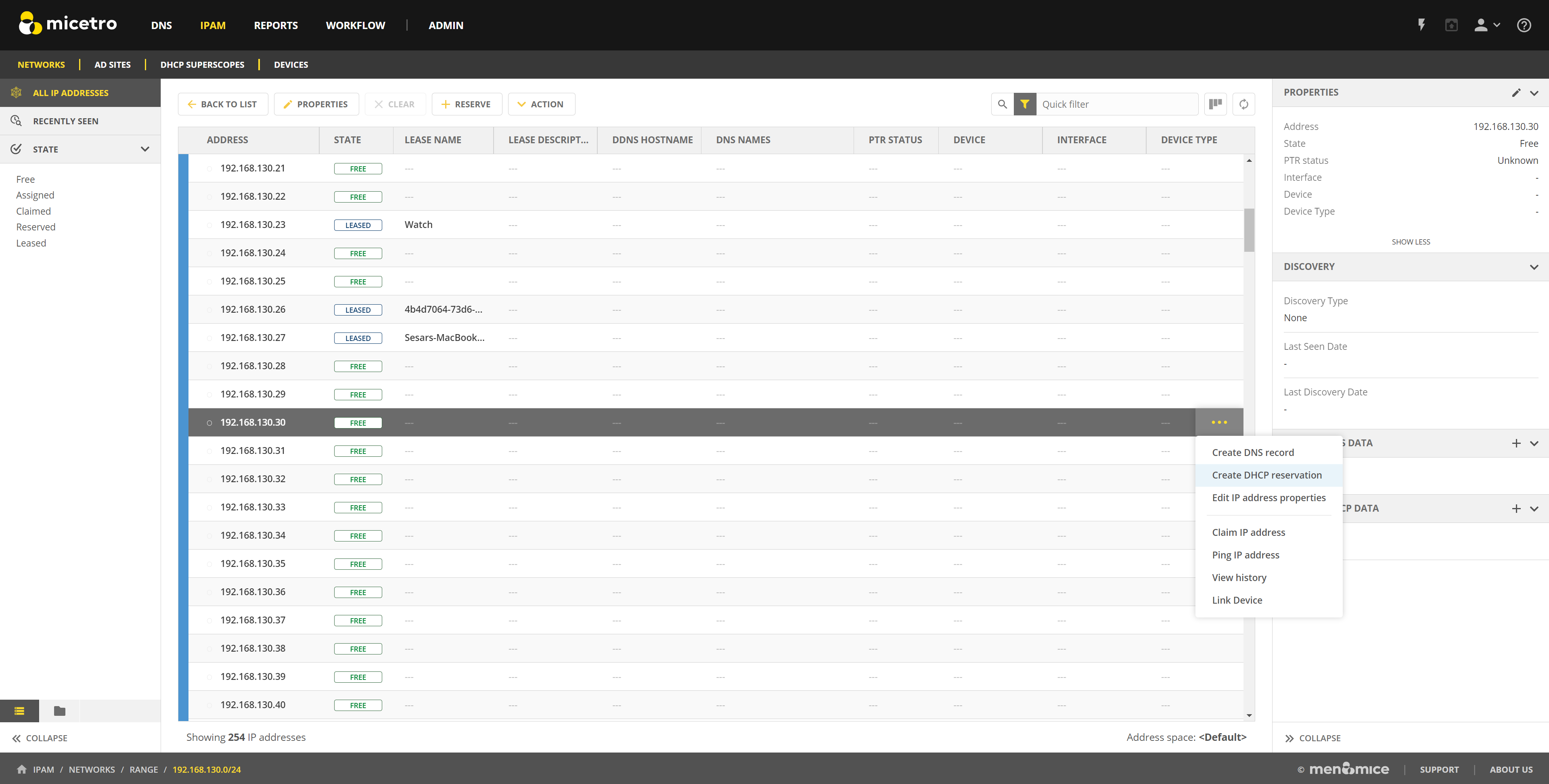 Select an IP address in the data grid and select Reserve on the task bar or use the Row … menu to select Create DHCP reservation.