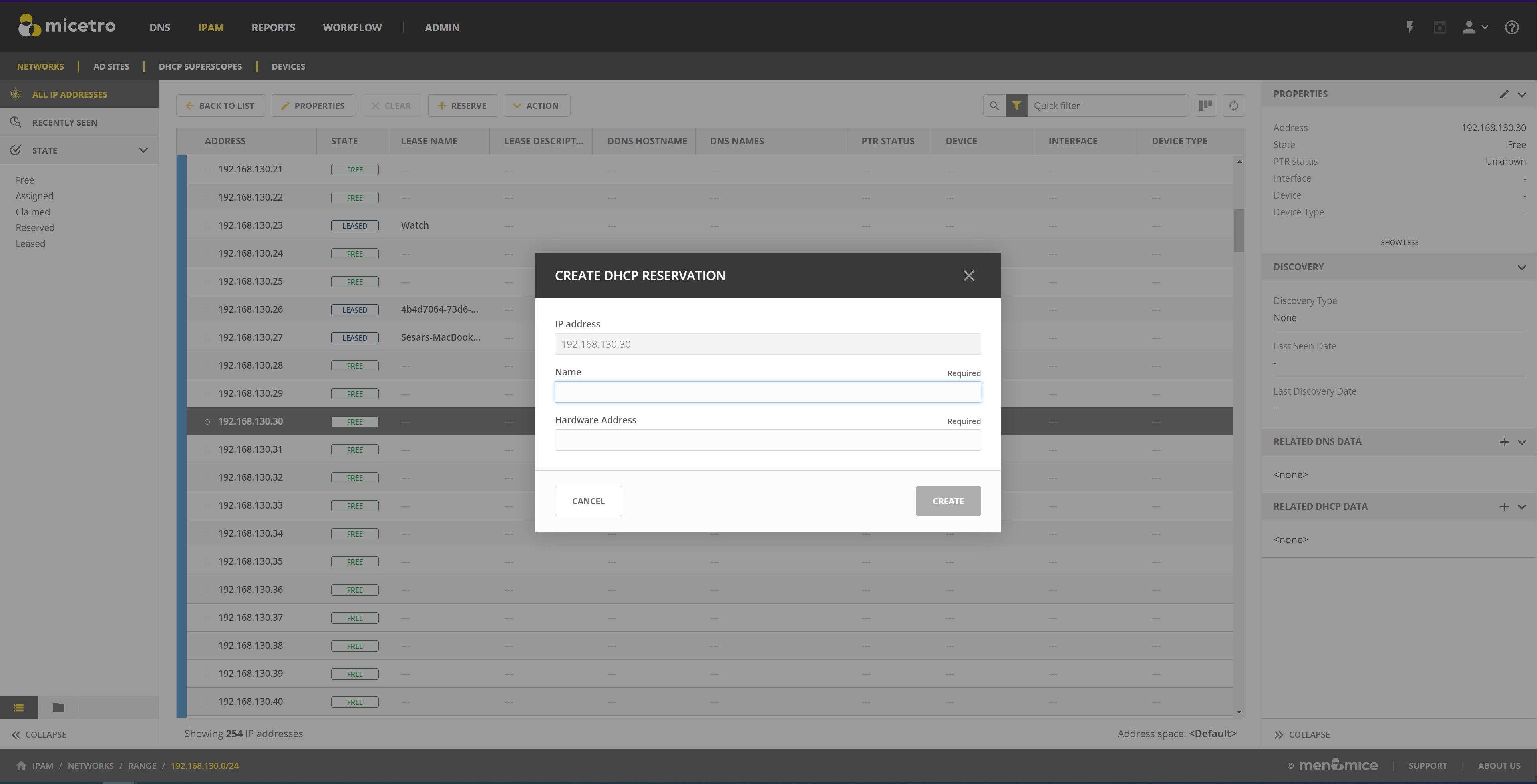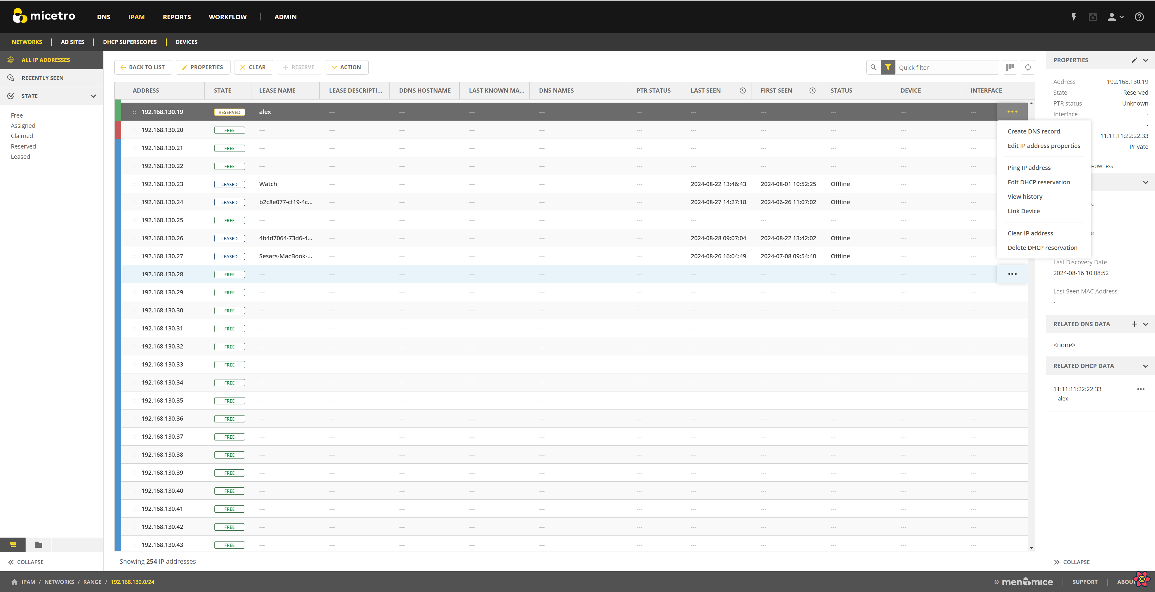 You can create a DHCP reservation through the IP Address page in Micetro.