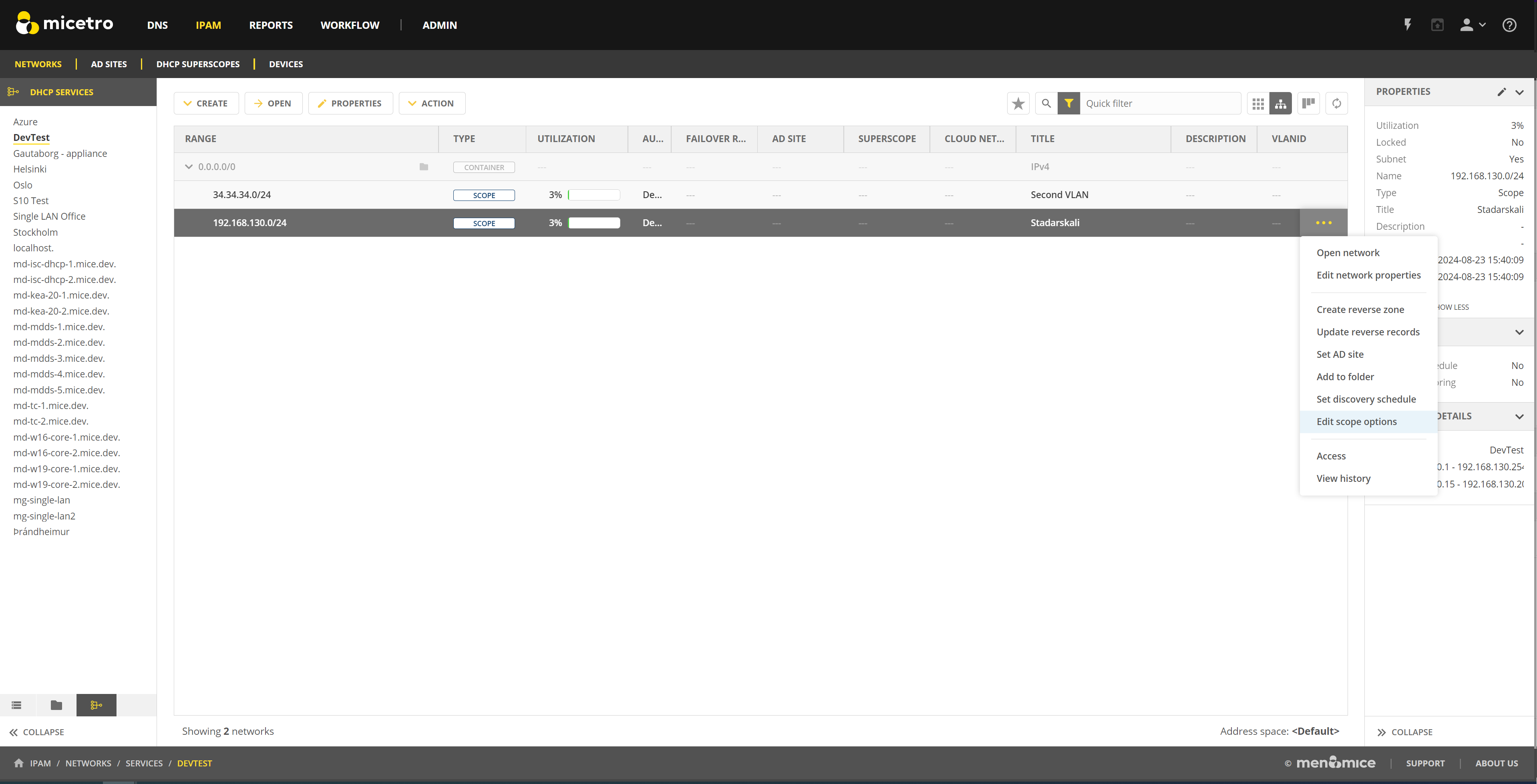 Because Micetro’s connection with Meraki is bidirectional, you can perform some of the most common Meraki DHCP management tasks for DHCP-enabled networks directly through Micetro, including: