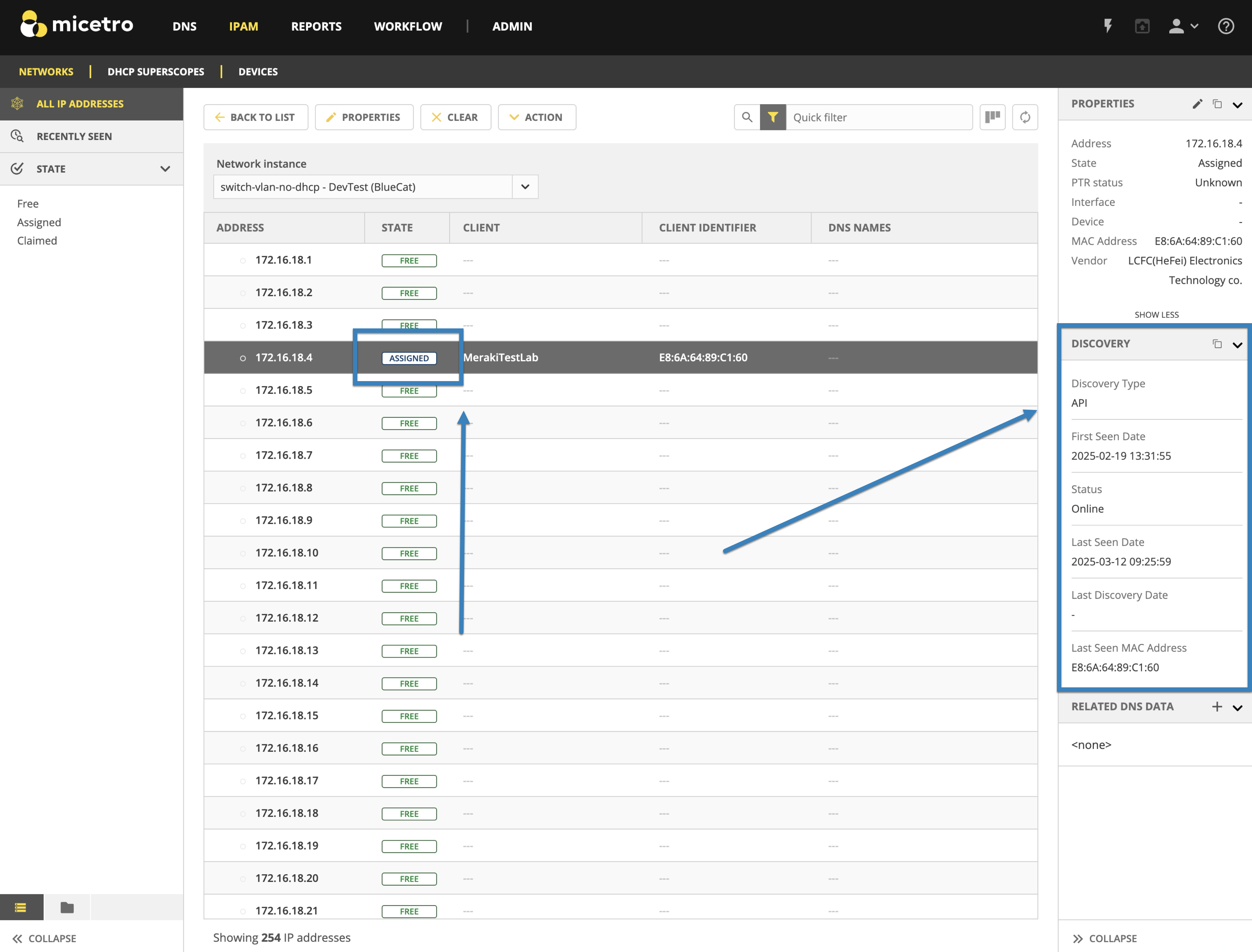 Clients on non-DHCP networks have an Assigned State and their Discovery Type is API, which can be viewed in the Inspector.