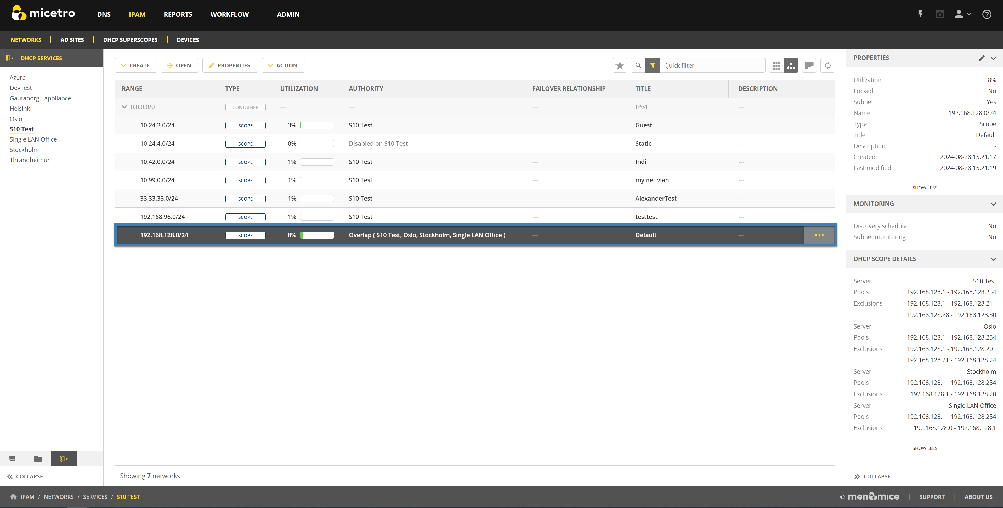 In some Meraki environments, LANs on different networks may share the same IP address range. When multiple LANs share the same IP range, they are displayed in Micetro as overlapping instances. The Authority column of the grid displays “Overlap” and the names or number of instances, depending on the number of overlapping instances.
