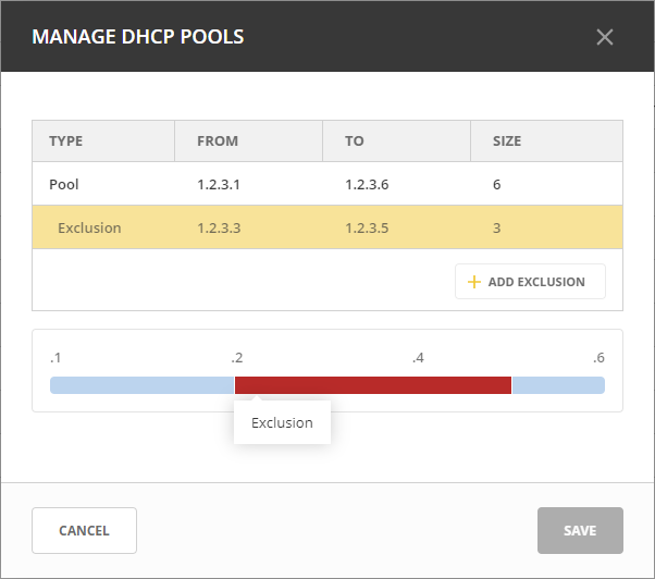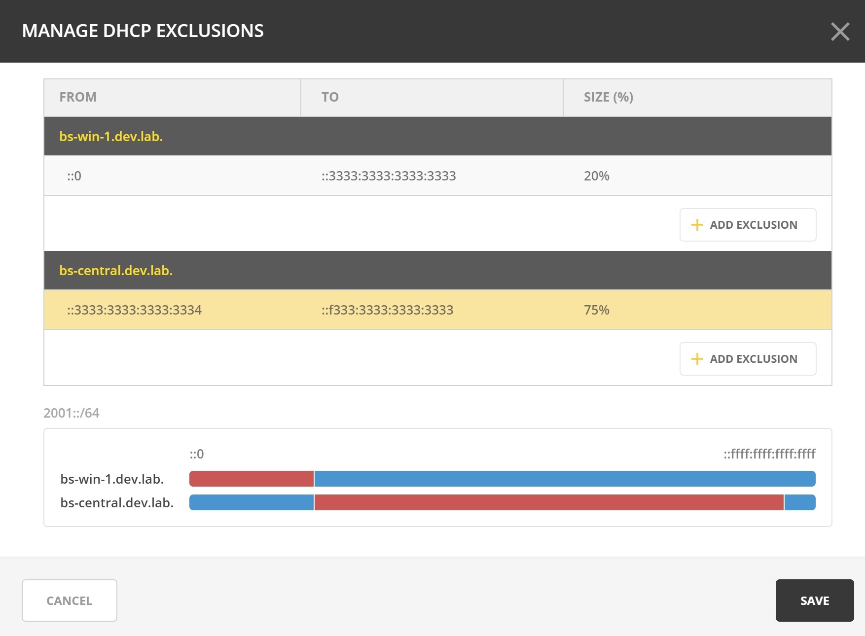 If the exclusion range doesn’t have the space to accommodate the specified percentage of IP addresses, it will not allow you to add this exclusion range. Adjust the From address or lower the percentage as needed.