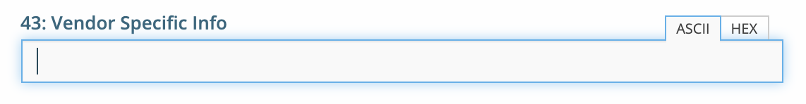 Certain DHCP options, such as DHCP option 43 (Vendor Specific Info), require the value to be in HEX format. In such cases, the user interface allows the value to be displayed in both HEX and ASCII format by selecting the appropriate tabs above the input field.