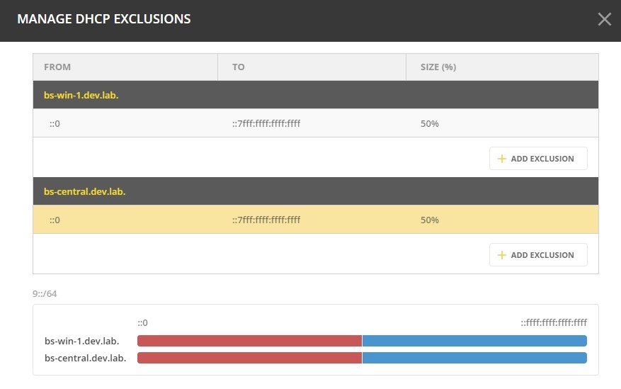 Click Add Exclusion for the first server. Select the percentage of the address range you want to exclude from the first server and click Add.`