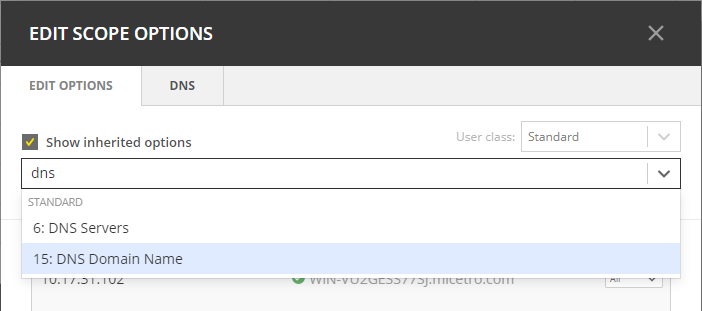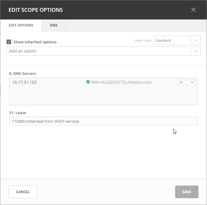 DHCPv4 and DHCPv6 scopes inherit DHCP and DDNS Options from the parent DHCP server. DHCPv4 and DHCPv6 reservation inherit DHCP and DDNS options from the DHCP scope. However, these options may be changed by editing the options for the specific scope or reservation.
