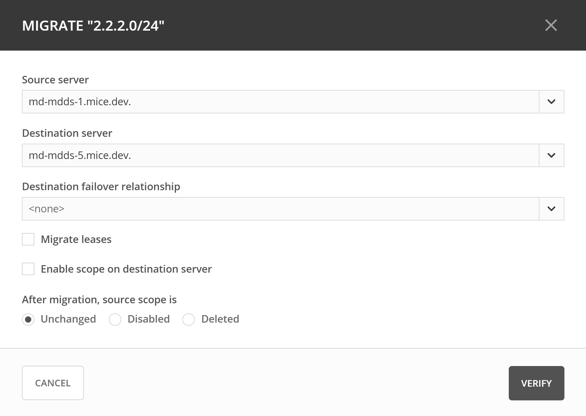 Additionally, it’s possible to migrate scopes from servers that are dead or unreachable, but with some limitations. Refer to Migrating From Unreachable Servers below.