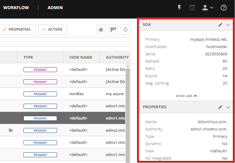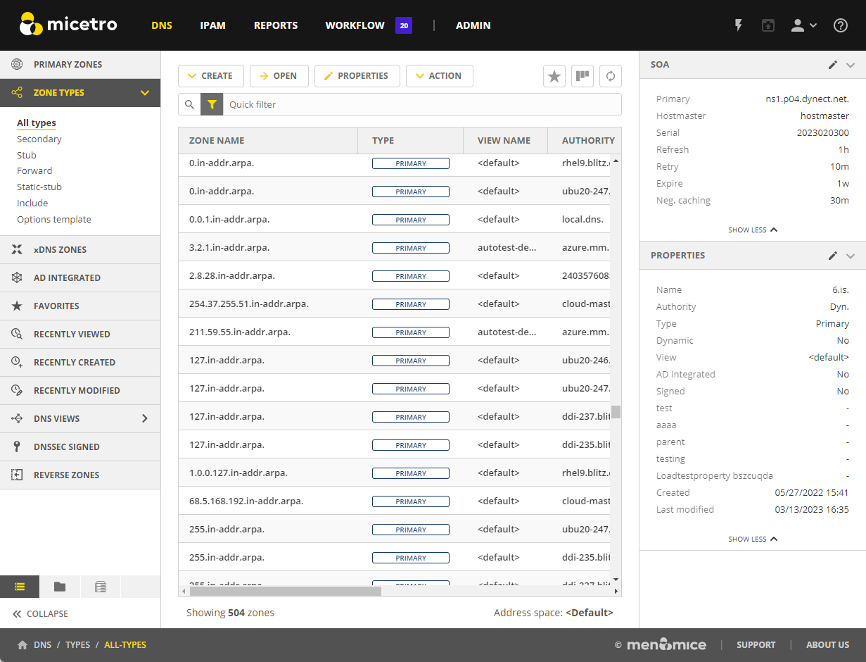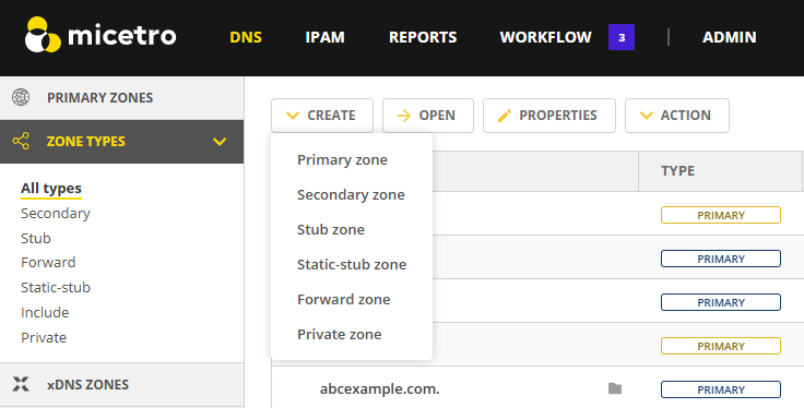 Micetro enables you to manage your DNS zones, both in the Web Application and through the API. You can create new zones, edit or migrate existing zones to different servers, promote secondary zones to primary zones, and delete zones. Additionally, you can edit zone properties and options.