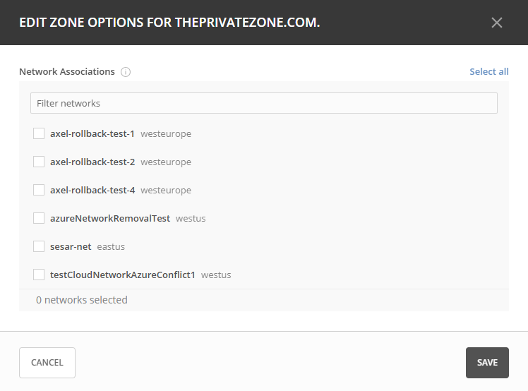 In the Edit Zone Options dialog box, select or deselect the networks where the private zone will be accessible. DNS queries for the zone will only resolve to the selected networks.