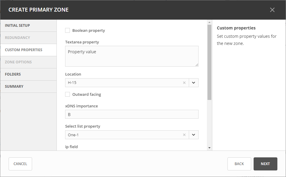 If custom properties have been defined for zones, they can be edited in a separate step. Custom properties provide additional attributes that enhance the ability to understand, search, and sort zone data in Micetro.