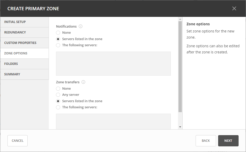 In the Zone Options step, you can specify which DNS servers will be notified of changes to the zone and to which servers it is allowed to perform zone transfers.