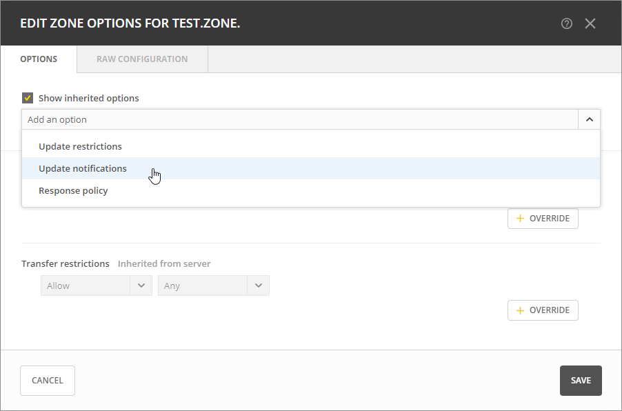 By default, the Show inherited options checkbox is selected. When selected, any inherited options that are applied to the selected zone are displayed. Inherited options are settings that are propagated from higher-level configurations, either the server or view. You can edit the inherited options by selecting Override or by selecting the specific option you wish to modify from the dropdown.