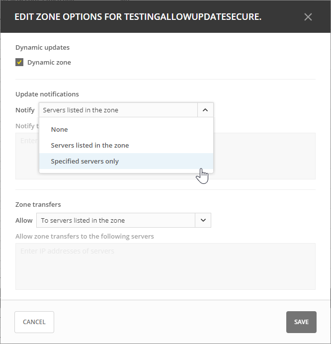 Update notifications (primary, secondary): Specify which servers should receive notifications when changes are made to the zone’s DNS records. When dynamic updates occur, servers listed in the update notifications receive notifications to ensure they can synchronize their records accordingly.