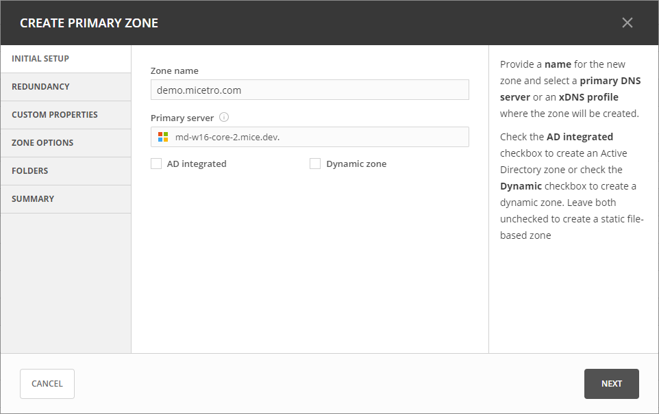 Follow the steps of the wizard. The number of steps varies depending on the zone type and the configuration of Micetro. Refer to the zone-specific instructions below for each type.