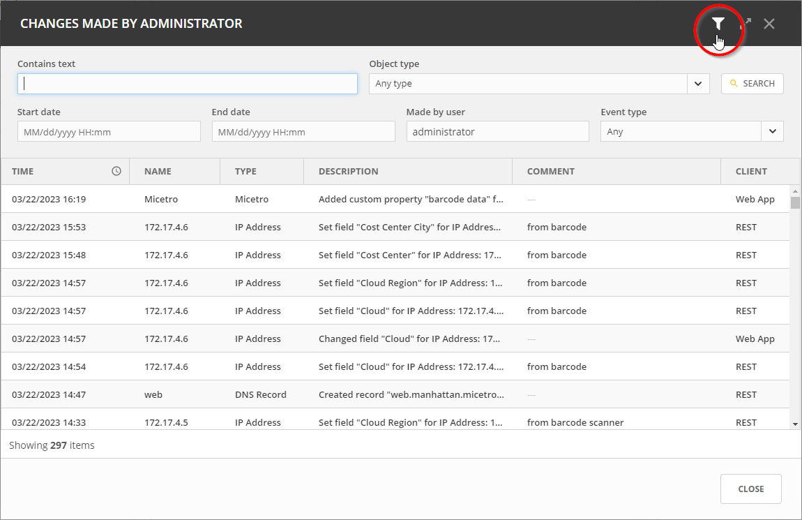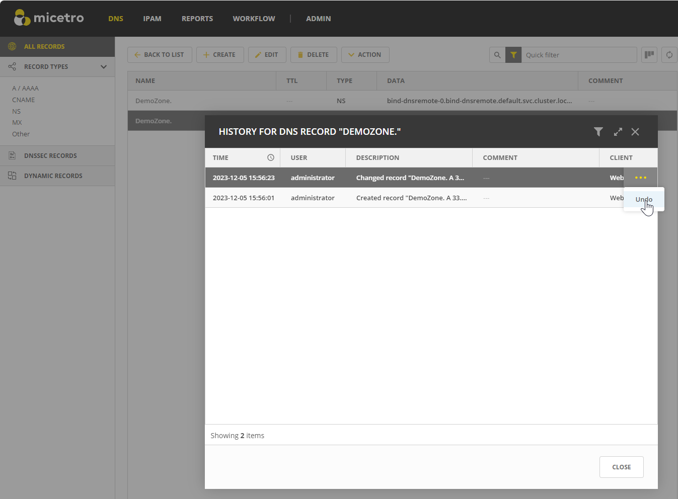 You can access and navigate all changes made to any object in Micetro. The object change history provides a detailed log of all modifications made to any object, including timestamps, user information, actions taken, and user-entered comments.