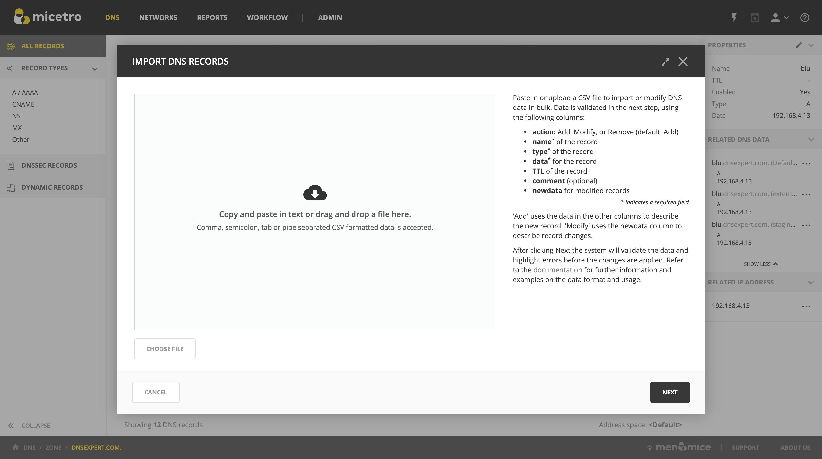 The option to import DNS Records is found on the menu in the list of DNS zones, and allows you to import records into multiple zones simultanously.