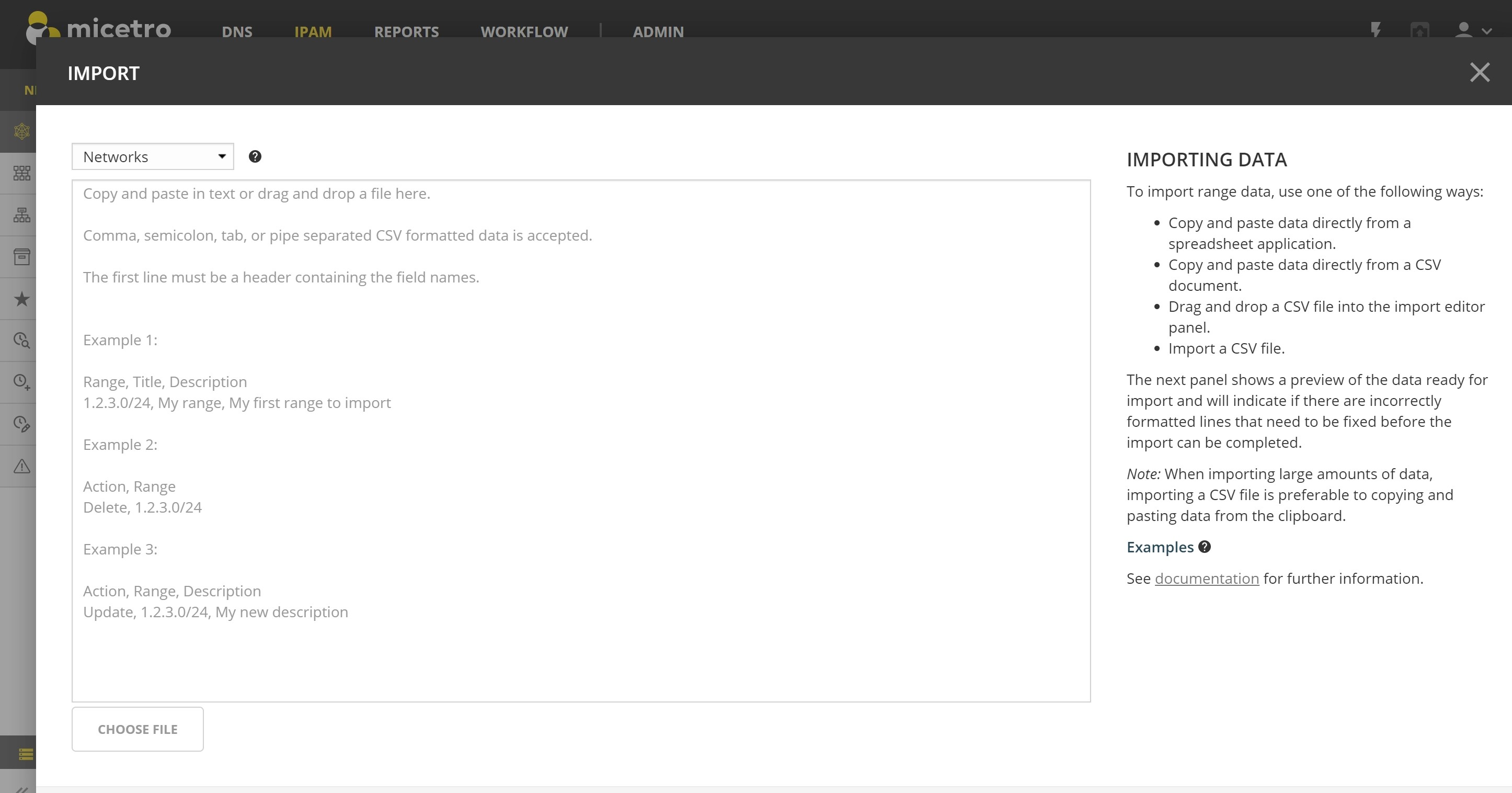 IP addresses can be imported when the Import Data wizard is opened from within a specific network, or from the networks overview page, where networks can be imported using the same wizard.