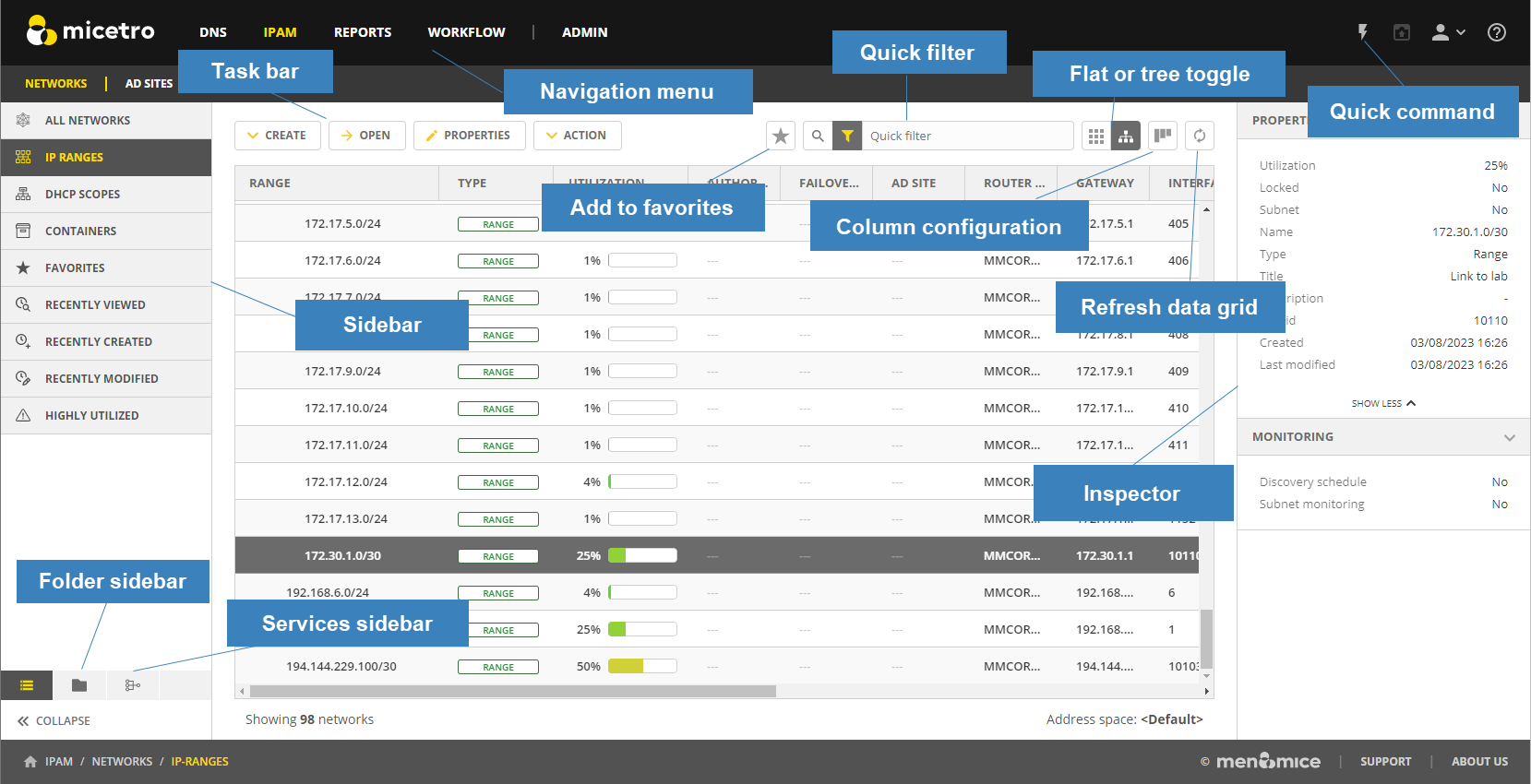 Micetro is centered around the data grid, which lists objects in the system, such as DNS zones, DNS records, IP address ranges, DHCP scopes, and IP addresses.