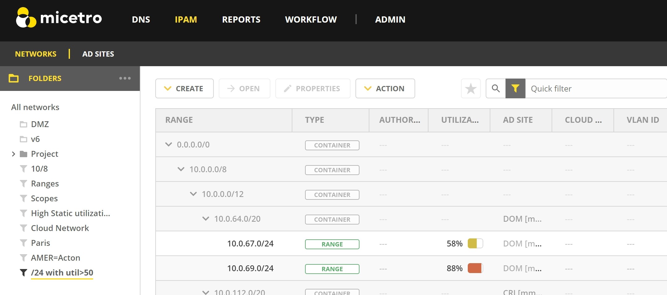 IPAM: Perform various actions related to network and DHCP management, such as creating a new network range or DHCP scope, managing IP addresses within a network or DHCP scope, and creating DHCP reservations. You can also view related DNS data for IP addresses within a network and add DNS hosts for IP addresses.