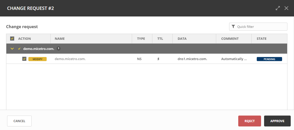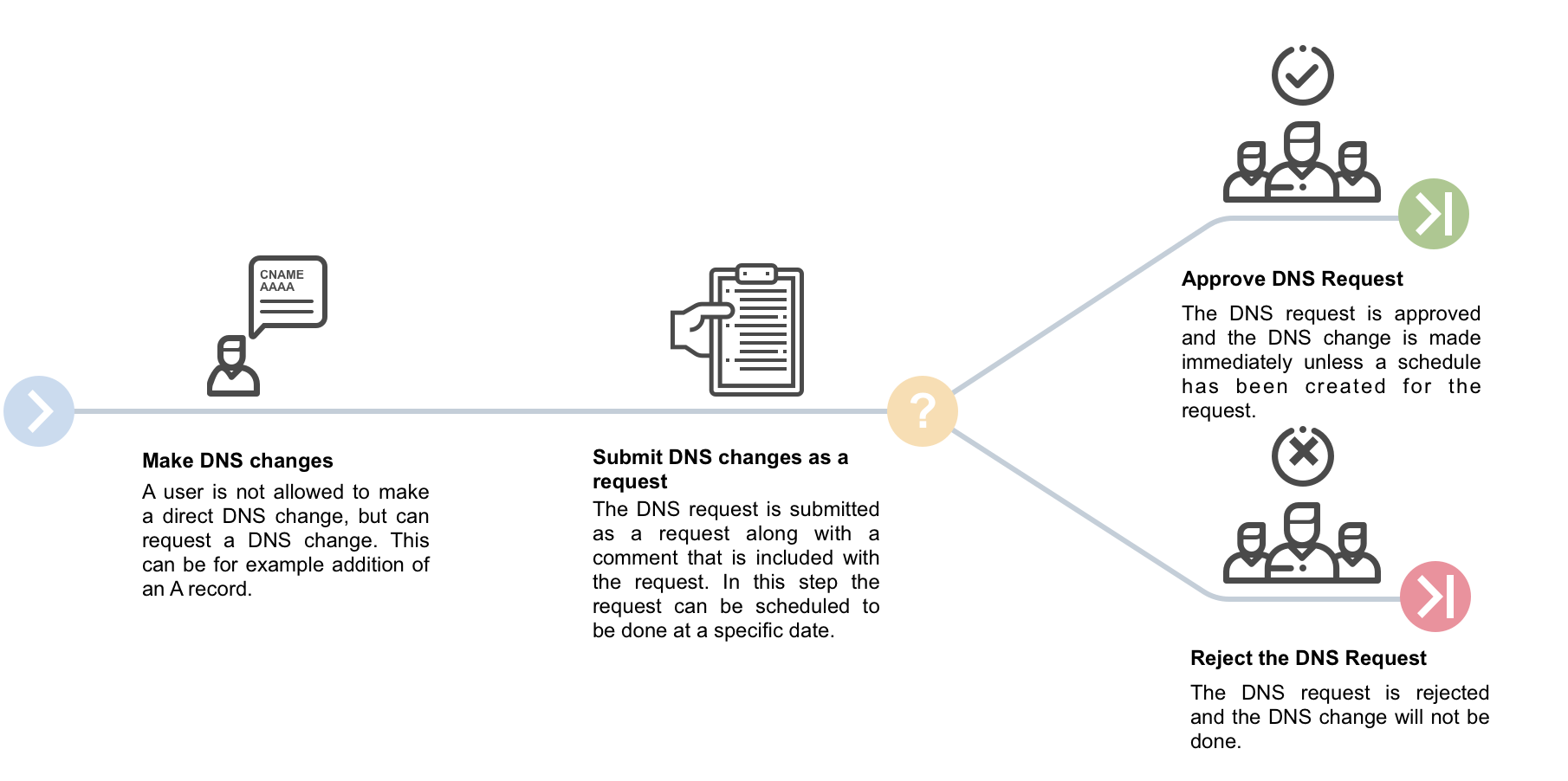 The request can be either approved or rejected. If the request is approved, the DNS change is made and the DNS zone is updated automatically with the new data, either immediately or at a time specified in the request. If the DNS request is rejected, the request is deleted and the DNS request history will indicate a reason for the rejection.