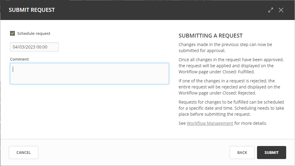Authorized users and approvers can also submit change requests, even if they have full access, in order to make scheduled changes.
