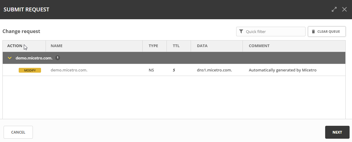 Adds the changes to a DNS request. Number in badge on request queue icon in top right corner will increase accordingly |