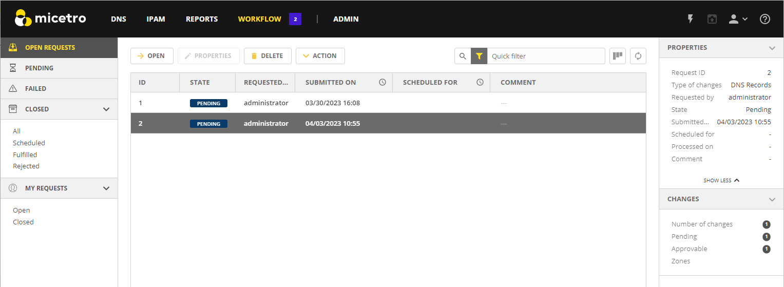 The Workflow module allows the user to submit ‘change requests’ for creating, modifying, or deleting DNS records: